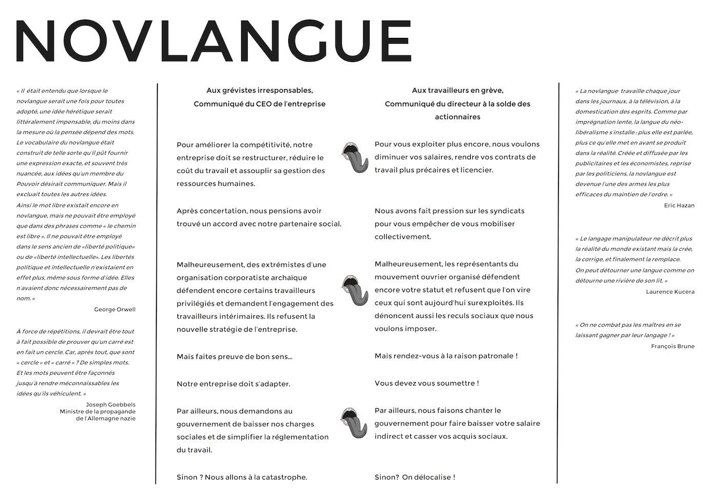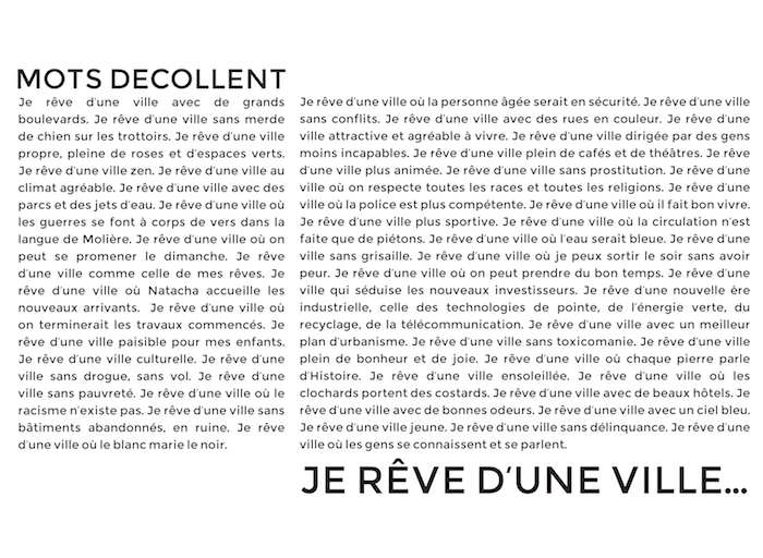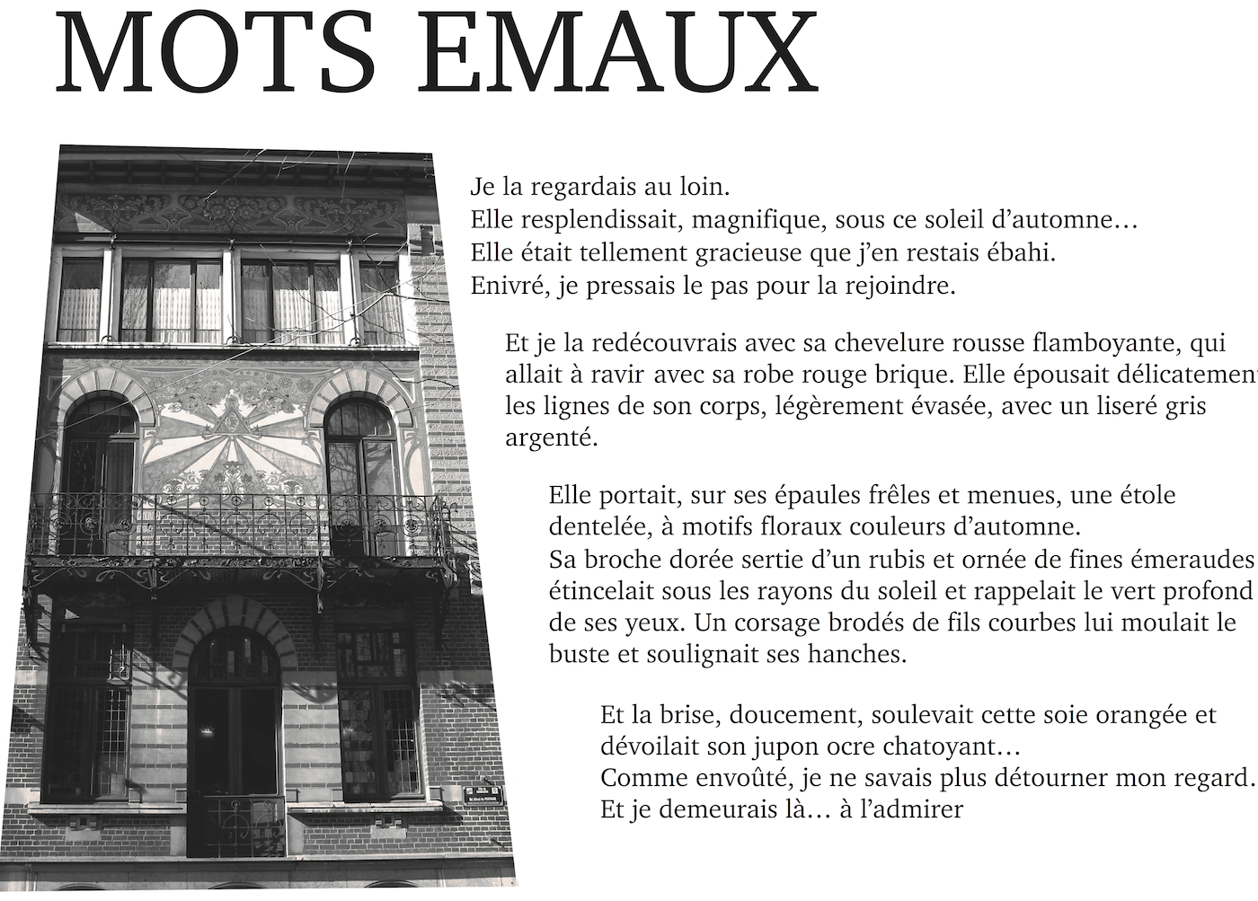 L’idée était de réaliser, dans la rue de la Digue, une exposition qui présente des points de vue sur Charleroi selon sept axes. Les arbres devant le bâtiment de la FUNOC sont le fil conducteur et la structure de cette expo éphémère. Chaque arbre portera un calicot, une banderole affichant 7 thèmes Arbre 1 : Les mots décollent Arbre 2 : Les mots d’enfer, les mots qui minent pour la sidérurgie et les charbonnages Arbre 3 : Le bal des mots Arbre 4 : Les mots émaux pour la verrerie et l’Art nouveau Arbre 5 : Les mots en bulles pour la bande dessinée Arbre 6 : La novlangue Arbre 7 : Le ring des mots (encore toute une symbolique de notre ville) Exposition permanente du lundi 17 au vendredi 21 mars – Animations les mardi 18 et jeudi 20 mars de 10 à 12 heures. FUNOC asbl, rue de la Digue, 5, 6000 Charleroi – 071/270 606 Les mots décollent mots_decollent_700.png Télécharger la version PDF Ce texte est le résultat de deux ateliers d’écriture qui ont eu lieu à la bibliothèque de l’UT sous l’animation de Fidéline Dujeu. Les participants du groupe CRL Anglais ont été invités à écrire sur la ville de Charleroi en s’inspirant des photos et des textes exposés dans le hall de l’UT. Ils ont d’abord exprimé leur ressenti par rapport à une photo, un texte de leur choix. Ensuite ils ont imaginé ce que serait le Charleroi de leurs rêves. A tour de rôle, ils ont livré leurs envies, leurs désirs, leurs élucubrations…bref leur espoir de voir un jour leur ville décoller “de la morosité, de la déprime, de la noirceur” dans lesquelles elle leur semble engluée. Les mots d’enfer, les mots qui minent motsdenfer.jpg motsdenfer.tif « Les mots d’enfer, les mots qui minent” est une réalisation du groupe infographie. A partir de deux piliers de Charleroi, la métallurgie et la mine, ce groupe a mené avec ses formateurs trois activités pour se constituer un”pot” de mots 1)Un travail “A la manière de… Pierre Alechinsky Les stagiaires se sont basés sur la description de La Louvière de Pierre Alechinsky Ils ont écrit sur ce modèle: Charleroi: sa chaleur, ses usines, ses bâtiments démolis… 2)Pour chacun des mots(métallurgie et mine) ils ont travaillé deux axes pour chacun des mots: l’axe des idées(quand je pense à métallurgie, je pense à…) et l’axe des sons(association avec des mots proches au niveau des sons même s’ils n’ont rien à voir avec le sens du mot de départ -ex: métallurgie magie…) 3) Ils ont aussi inventé des mots à partir de deux mots de départ Par exemple métallurgie et mine. métallergie…) Le bal des mots baldesmots.png Télécharger la version PDF Baignés dans les mots au quotidien, à travers l’étude du français, les stagiaires en alpha 3 à la FUNOC, proposent avec le Bal des Mots, un regard original et réaliste sur Charleroi au fil du temps. La visite de l’exposition « Charleroi….. » de Fidéline Bajeu et Thomas ….., les a incités à construire leur projet. En atelier d’écriture ils ont imaginé et construit ensemble « Bal des Mots ». C’est avec grand plaisir qu’ils le partagent avec vous ! Bonne lecture… Les mots émaux motsemauxtest.png Télécharger la version PDF Les mots émaux, c’est un clin d’oeil à l’Art Nouveau dans Charleroi. En effet, beaucoup de nos façades, de nos rues sont imprégnées d’Art nouveau. Les stagiaires du Ceressa ont mis l’accent sur ce courant artistique par divers moyens d’expression. D’une part, ils ont écrit un texte collectif qui compare la façade de la Maison Dorée à une femme. L’extrait choisi fait partie d’une nouvelle qui sera diffusée par la suite. Ces stagiaires ont aussi peint un vitrail en noir et blanc pour illustres leur histoire. Ils ont créé un décor autour d’un arbre de la Rue de la Digue. Ils préparent une visite guidée dans Charleroi, autour de l’Art Nouveau. La novlangue novlangue.png Télécharger la version PDF Vous ne connaissez peut-être qu’une seule langue : le français. Mais vous en parlez peut-être une autre sans le savoir : la novlangue. Une nouvelle langue. Une langue parlée par les hommes politiques, les économistes, les experts et les spécialistes en tout genre. Et cette langue est reprise par les médias. Sans y penser, on utilise donc des expressions de cette novlangue. Lire aussi