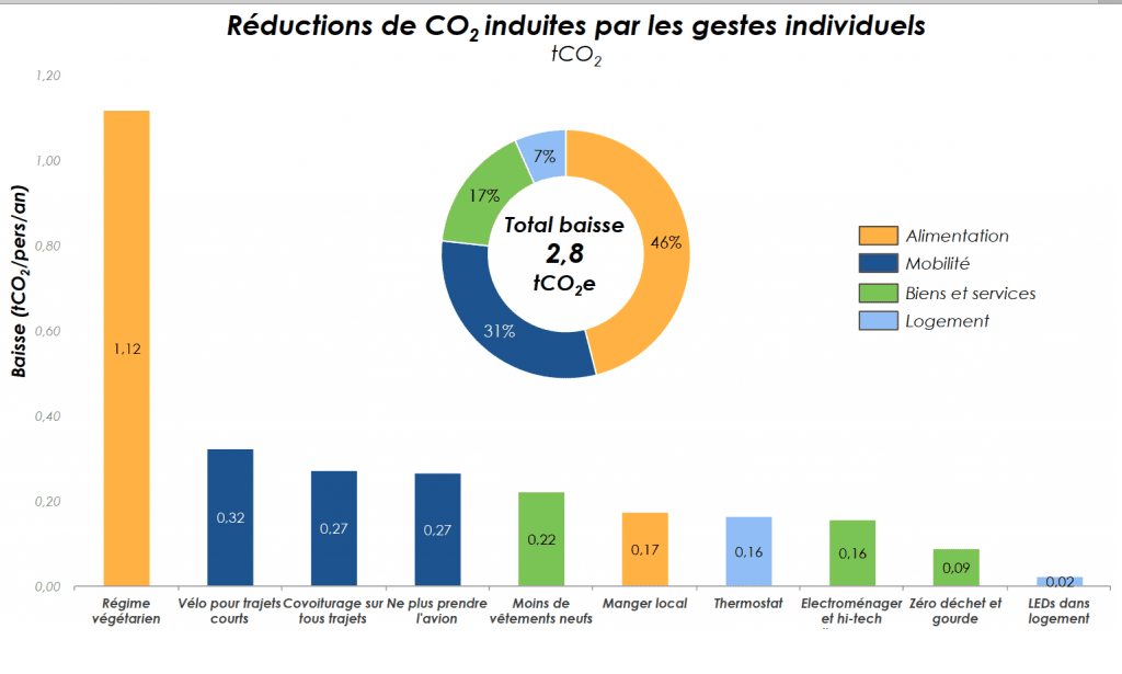 En tête des mesures les plus efficaces, le fait de devenir végétarien (46 % du total de la baisse des émissions liées aux changements de comportement). Devenir végétarien permet en effet de limiter les émissions de méthane des ruminants et de lutter contre la déforestation.
