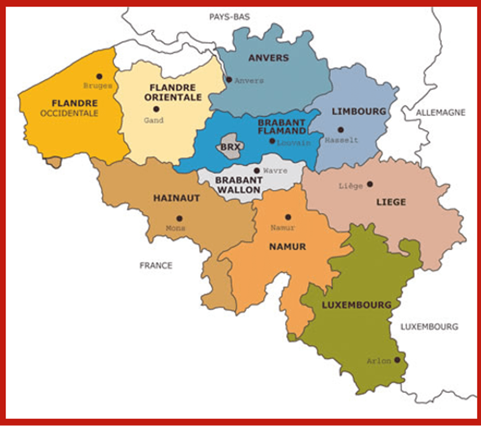 Il y a 581 communes en Belgique. En Région wallonne, il y a 262 communes et 5 provinces: Brabant wallon, Hainaut, Liège, Luxembourg et Namur. En région flamande, il y a 300 communes et 5 provinces: Anvers (Antwerpen), Brabant flamand (Vlaams-Brabant), Flandre occidentale (West-Vlaanderen), Flandre orientale (Oost-Vlaanderen) et Limbourg (Limburg). Enfin, il y a 19 communes dans la Région de Bruxelles-Capitale.