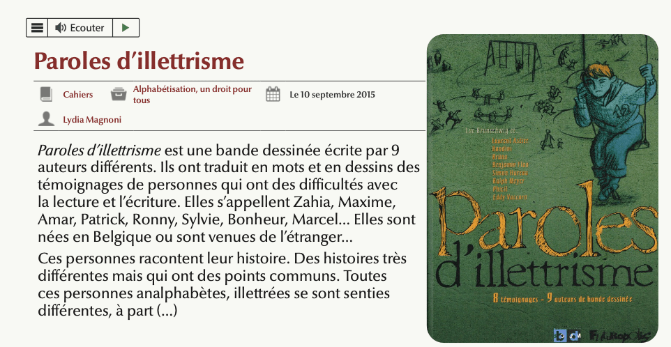 Comment vit-on quand on a du mal à lire et à écrire? La bande dessinée « Paroles d’illettrisme » est construite autour de la parole de personnes qui ont des difficultés en lecture et écriture.
